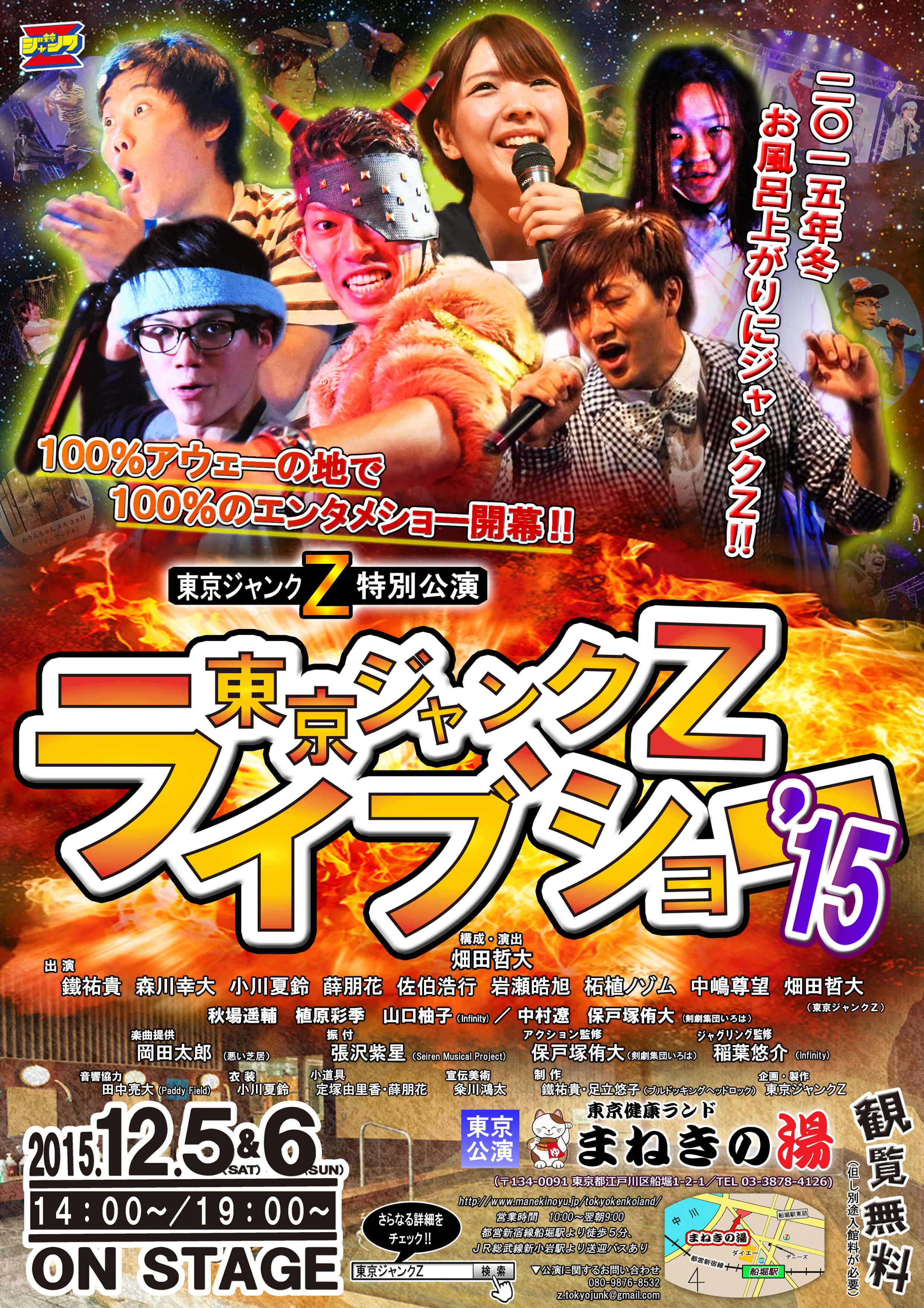 【日程】2015年12月5日(土)〜6日(日) 【会場】東京健康ランド まねきの湯 (〒134-0091 東京都江戸川区船堀1-2-1 03-3878-4126) 会場詳細はこちらから 【構成・演出】畑田哲大 【出演】 鐵祐貴・森川幸大・小川夏鈴薛朋花・佐伯浩行・岩瀬皓旭柘植ノゾム・中嶋尊望・畑田哲大(東京ジャンクZ) 秋場遥輔・植原彩季・山口柚子(infinity) 中村遼・保戸塚侑大(剣劇集団いろは)